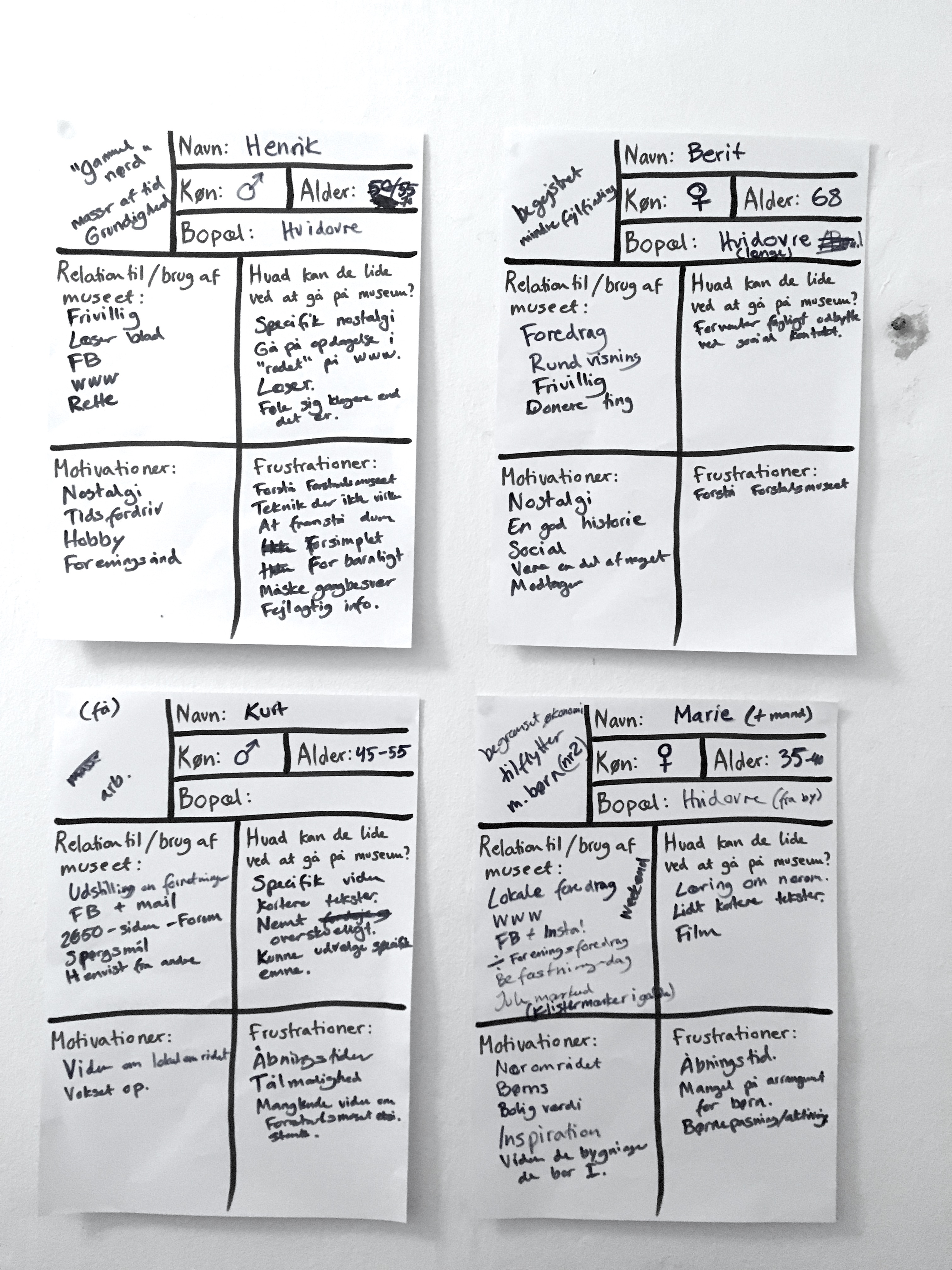 In order to keep the users (visitors) in mind through the entire process I started the meeting by making personas in collaboration with the employees at the museum. Four personas were created to personify the typical user groups engaged with the museum at the moment and those who might attend the museum as soon as there is a physical exhibition space. These personas were referred to throughout the rest of the meeting and project with phrases like "Berit wouldn't like that."