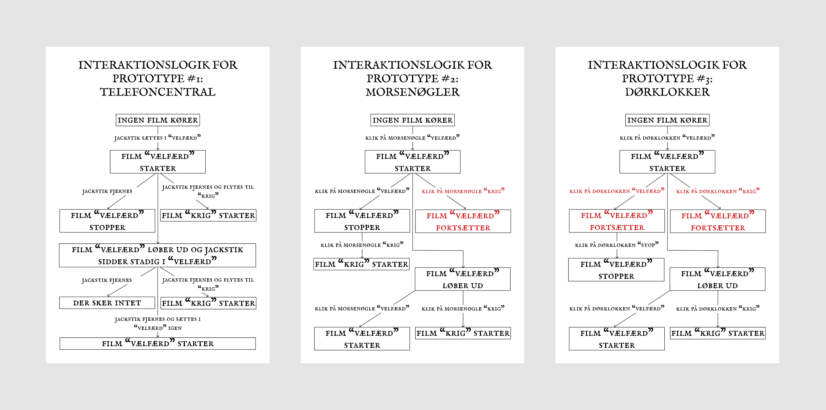 The prototypes were built using the bare minimum materials in order to test out whether user would find the interactions intuitive. The interaction logic was also decided for all three prototypes; e.g. what happens when you press a button when a movie is ongoing?