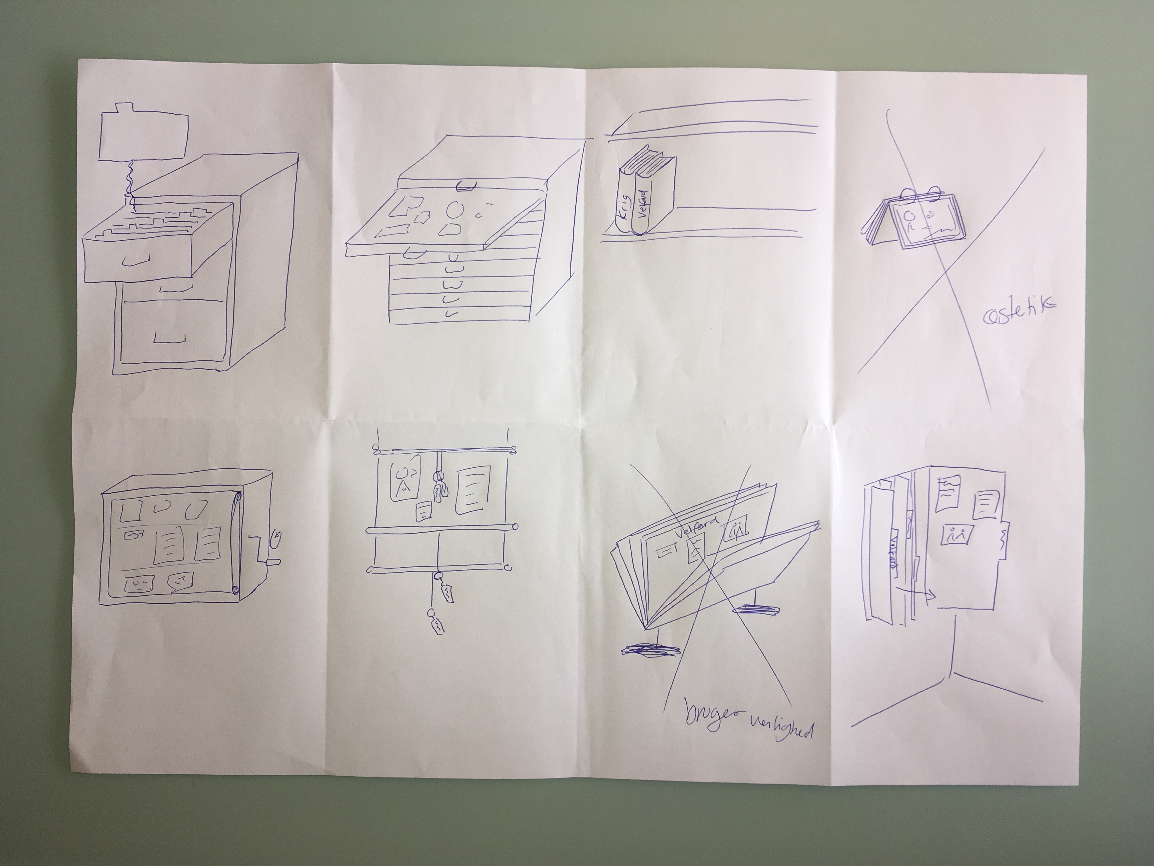 One of the components in the exhibition that was still a bit undefined was the "archive cabinet", since the scope and format presented a few considerations to be made in regards to security and preservation. Therefore I decided to do a Crazy 8 alongside the inhouse technician to come up with possible alternatives to this problem.
